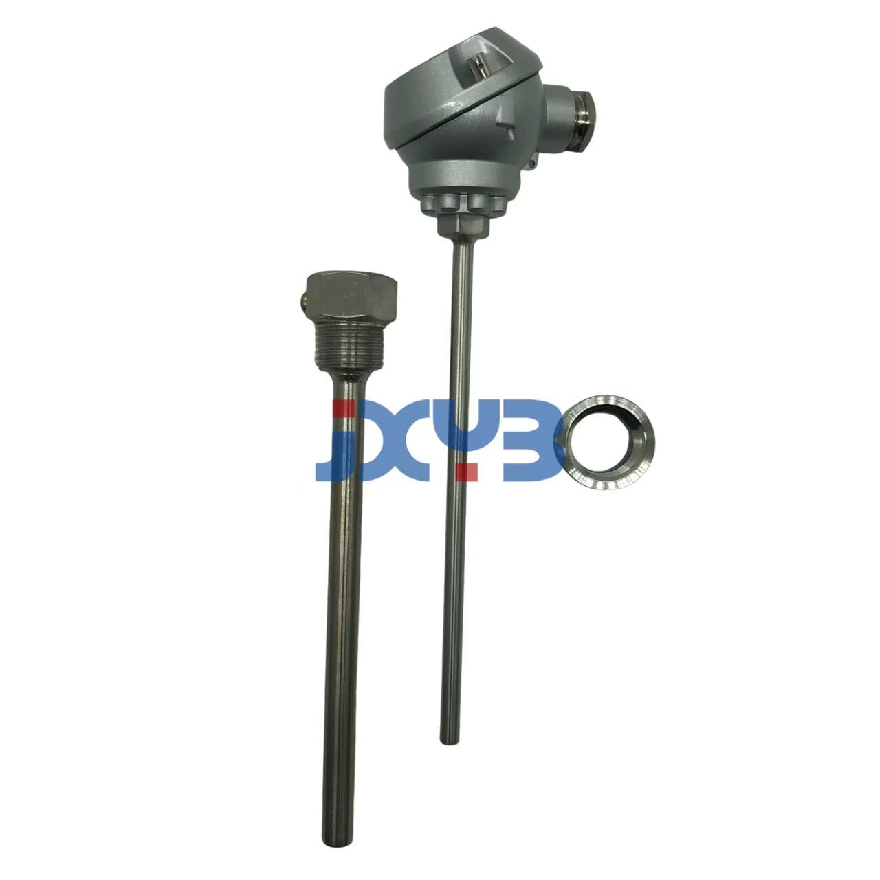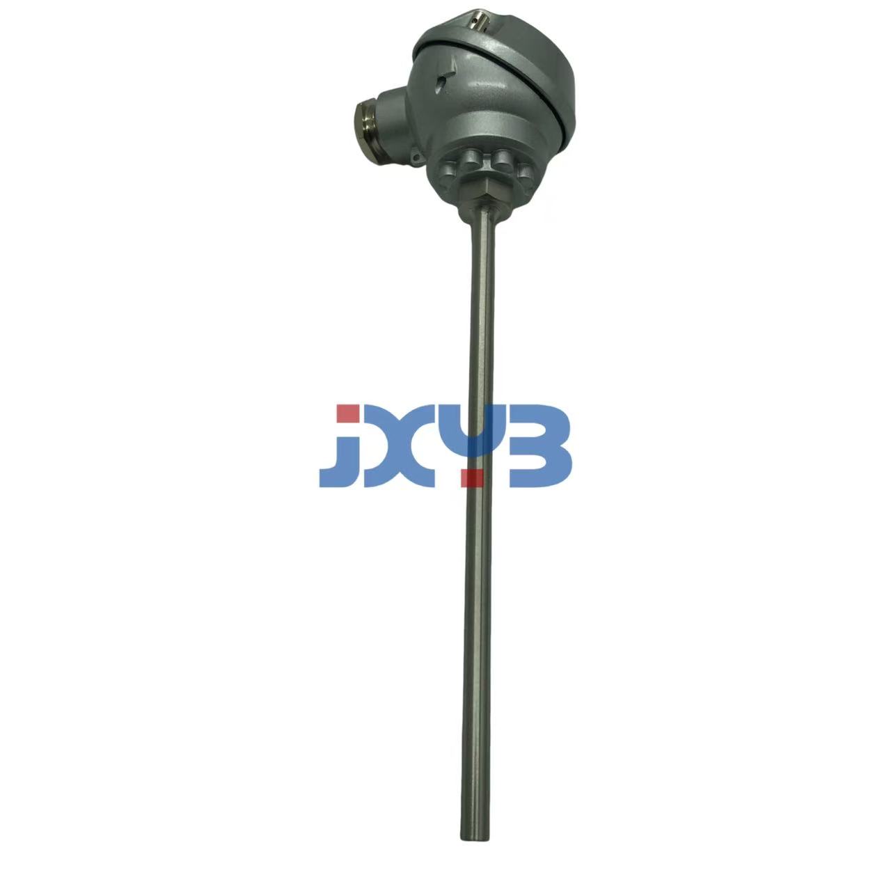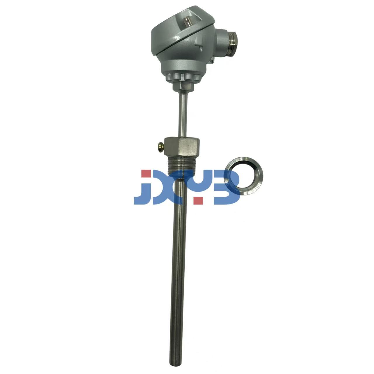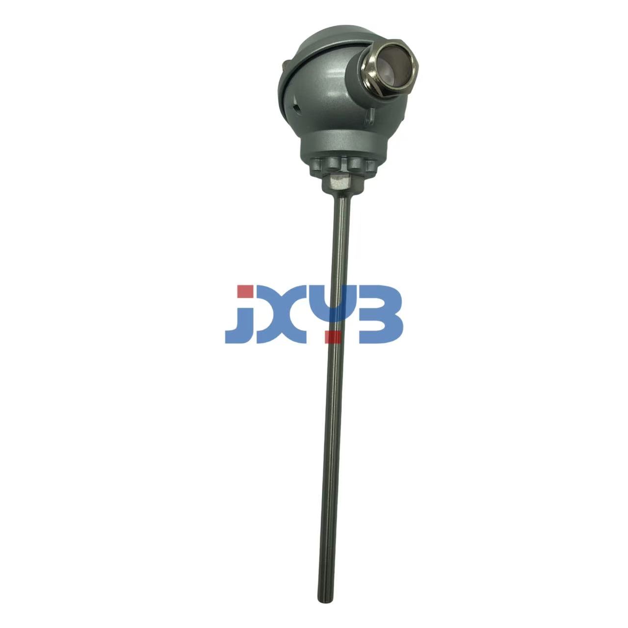 本實用新型公開一種高低溫可抽芯式溫度傳感器,包括法蘭,補強管,上保護管,外層不銹鋼保護管,活接,密封組件,廉金屬熱電偶和貴金屬熱電偶,法蘭與補強管焊接成一體,外層保護管外螺紋連接,法蘭套管通過螺紋連接活接和上保護管;貴金屬熱電偶與廉金屬熱電偶穿入后通過密封組件一和密封組件二固定密封,其中密封組件二采用卡套結構可實現(xiàn)廉金屬熱電偶在設備高溫時抽出,待設備降溫處于低溫段時重新插入測溫,本實用新型設計新穎,使用壽命長